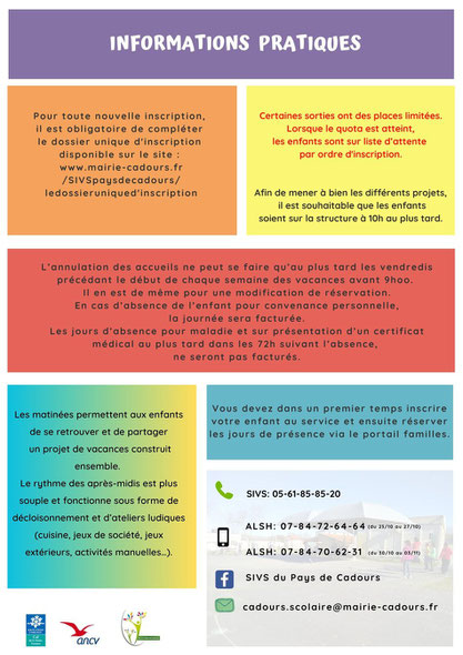 Les dates d’inscriptions (avec date butoir par période) sont indiquées sur les programmes des activités diffusés sur le site Facebook du SIVS du Pays de Cadours, sur le site internet de la mairie de Cadours, mais également adressés aux familles par mail.